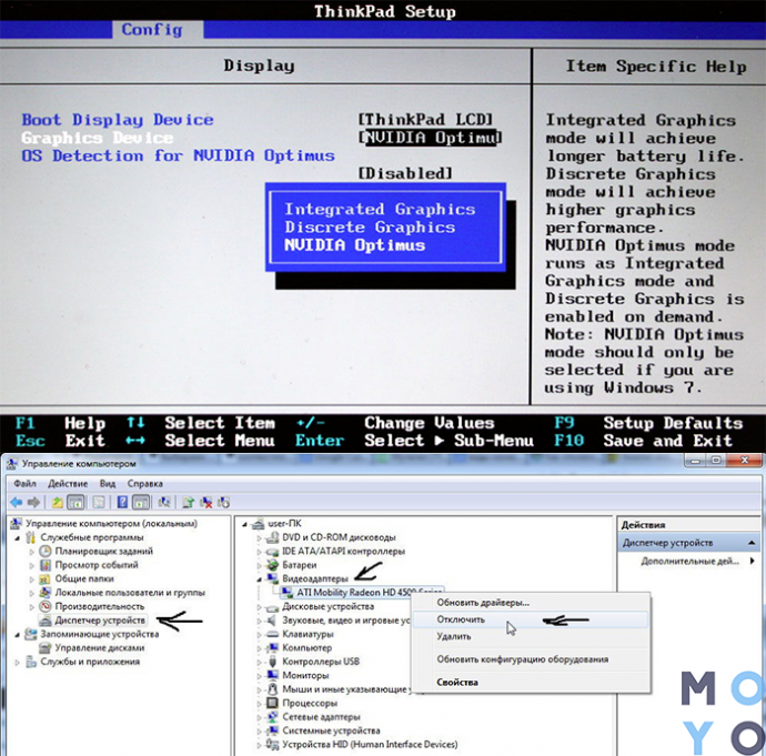 Если ноутбук работает на встроенной видеокарте на постоянной основе, а пользователю нужно переключиться на более производительное дискретное устройство, единственный способ сделать это – отключить интегрированную видеокарту полностью.