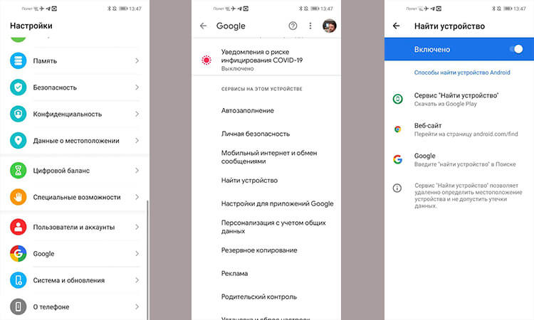 Приложение Google Find My Device является обязательным для пользователей Android и одним из самых полезных приложений для Android. Если вы добавили учетную запись Google на свое устройство Android, функция ”Найти устройство” будет включена автоматически. Вы можете проверить, что служба запущена, перейдя в ”Настройки”, далее выбираем ”Google” и открываем ”Найти мое устройство”. Иногда перед последним пунктом надо будет открыть пункт ”Безопасность”. После этого останется только убедиться, что функция включена.