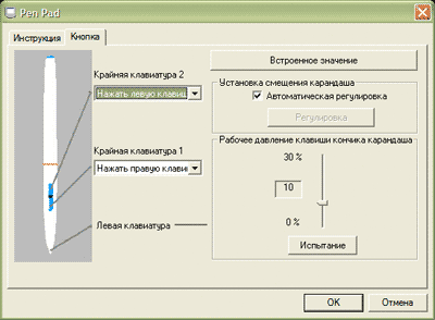 На второй закладке переназначаются кнопки на пере, варианты выбора: правая, левая или средняя клавиша мыши. И самое главное — калибровка пера. Регулируется положение «почти коснулся», здесь нас вполне устроили автоматические настройки. И чувствительность к нажатию, 30 градаций. Здесь значение по умолчанию 4 нам показалось совсем заниженным, приходилось сильно давить на перо для получения результата. Однако при выставлении значения 10 всё пришло в норму, перемещение курсора плавно и тактильно логично переходило в рисование тонкой линии, и в свою очередь, удобным образом небольшие изменения усилия нажатия регулировали её толщину.