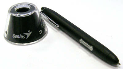 Перо похоже на обычную ручку, но содержит на боку кнопку-качалку, выполняющую роль двух основных клавиш мыши (по умолчанию нижняя соответствует правой). Наконечник резиновый, в комплекте два запасных и щипчики для извлечения сносившегося. Для размещения стилуса на столе подставка из мягкой чёрной резины, заключённой в прозрачный плексиглас, стильная. Есть скоба для крепления пера на кармане.