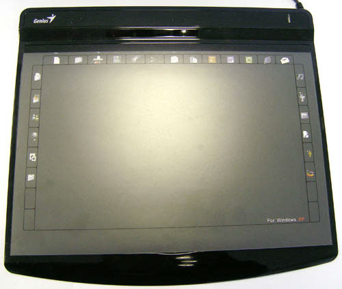 Чёрный, плоский, менее 5 мм в толщину планшет размерами 26 х 30 см, рамка снизу скруглённая, сверху утолщённая, чёрная глянцевая. Обратная сторона оснащена пятью резиновыми ножками, на столе держится надёжно. Справа, в верхней части синий индикатор, мигающий во время работы, рядом закреплён через демпфер тонкий шнур в пластиковой изоляции, длиной полтора метра с интерфейсом USB. Рабочая поверхность прикрыта прозрачной матовой защитной плёнкой, под неё можно положить лист бумаги с обозначениями активных клавиш. В комплекте два листа с преднастроенными наборами для XP и Vista.