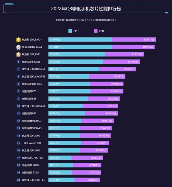 | 6 | MediaTek Dimensity 9000 | 996720 | 1264 | 4262 | 1+3+4 | Mali-G710 |